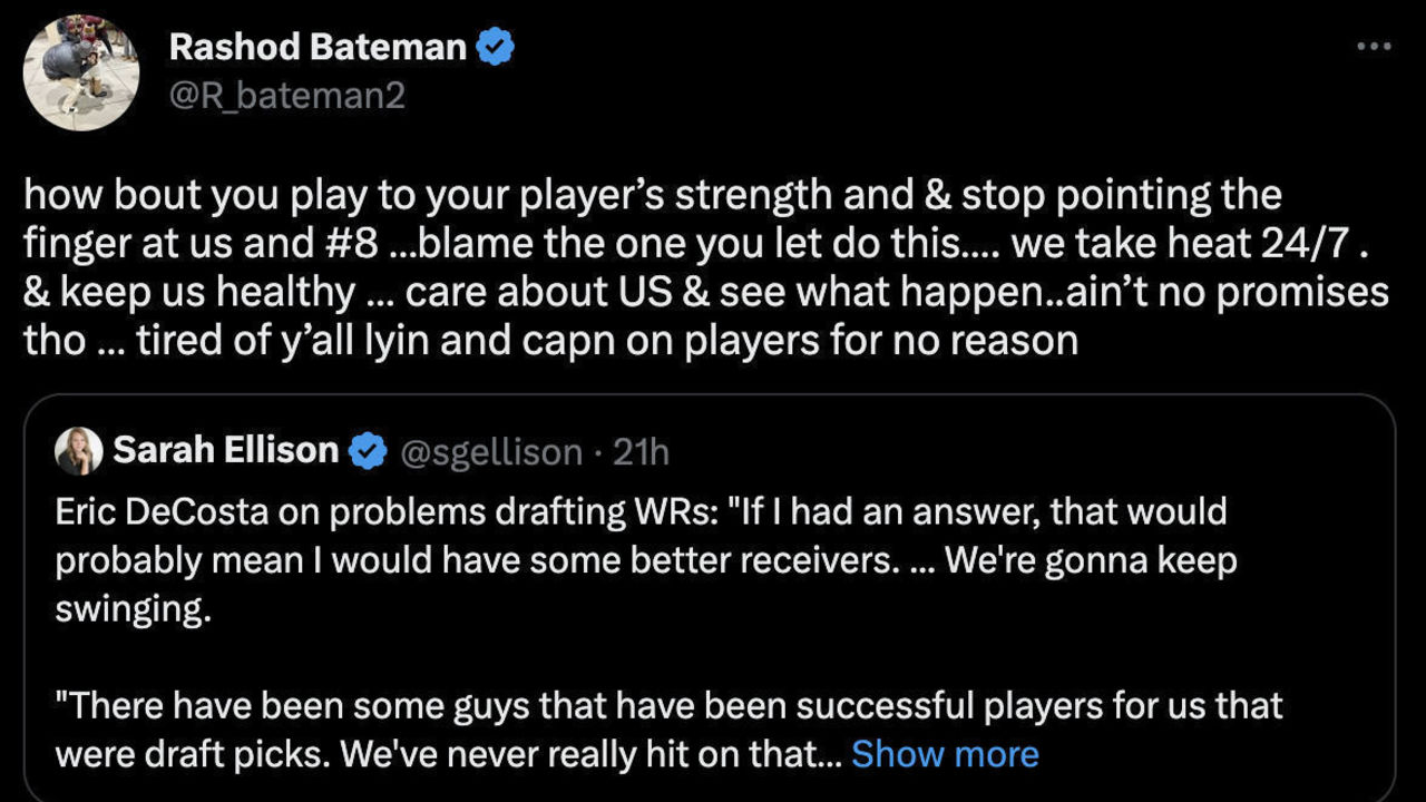 Baltimore Ravens wide receiver Rashod Bateman isn't pleased with general manager Eric DeCosta.