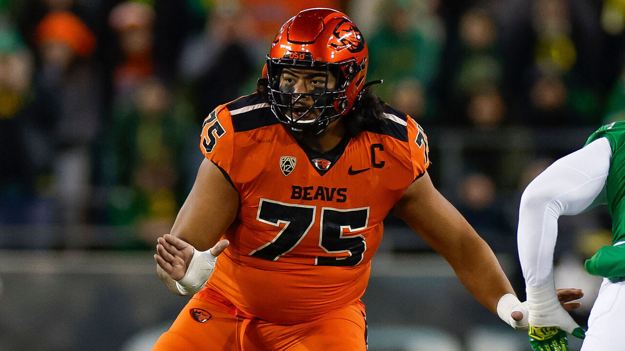 Fuaga is a powerhouse right tackle. The Oregon State product has the play strength and finishing demeanor to overwhelm opponents. He's also much more advanced in pass protection than your typical mauler, demonstrating fluid movement skills and excellent hand usage. Fuaga will have to play with better pad level and technique to consistently sustain blocks against NFL defenders in the run game, but there's no doubt he possesses the physical traits for high-level production in this area of the game, too. He should be a Day 1 starter with a high ceiling looking to the future.