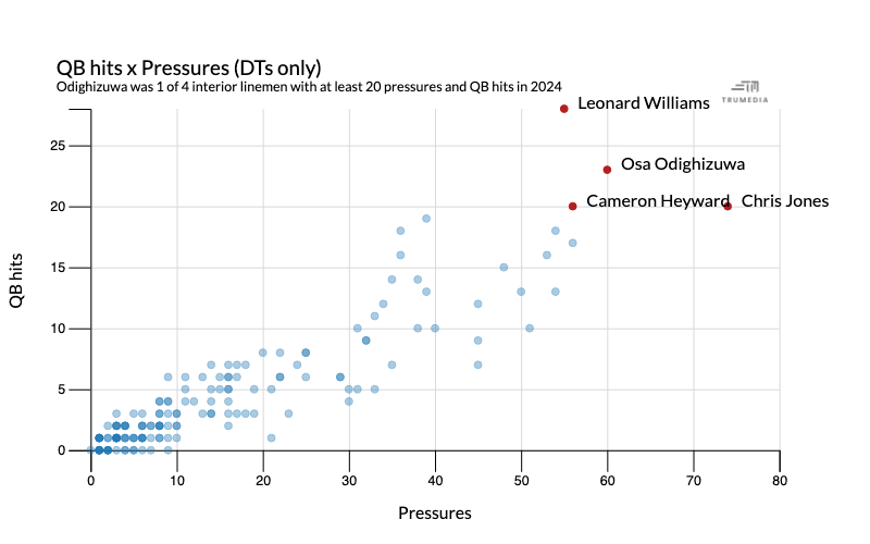 Odighizuwa, one of the more underrated interior linemen available, had his best year as a pass-rusher with the Dallas Cowboys in 2024, registering 23 QB hits, 4.5 sacks, and 60 pressures, the second-most in the NFL among defensive tackles, according to TruMedia.