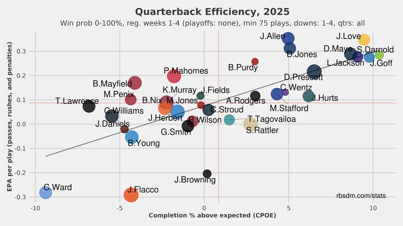 Ward ranks 32nd in passer rating and 32nd in EPA/play, and he's been sacked an NFL-worst 17 times. Tennessee's supporting cast doesn't do him any favors, but aside from his wild first NFL touchdown pass, the No. 1 pick hasn't shown much.