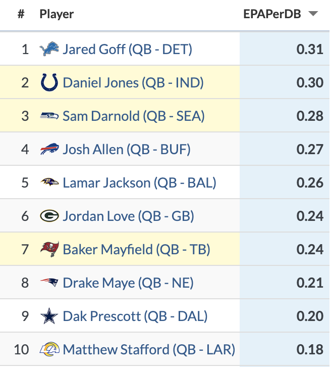 The 28-year-old is proving his belated 2024 breakout was only the beginning. Darnold leads a Seahawks offense that ranks fifth in scoring, ninth in yards, and eighth in EPA/play. Crucially, his ability to push the ball downfield has Seattle atop the league in explosive pass play percentage. Darnold's Week 3 performance in a blowout win over the Saints is the single best game from any quarterback this year by EPA/dropback. A 341-yard, four-touchdown effort last week against the Bucs is good for fourth on that list, and it would have been higher were it not for a bad-luck deflection on his last attempt of the game.