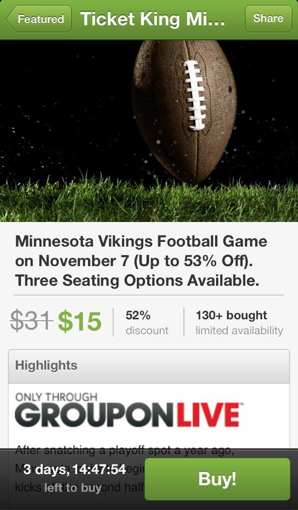 The discount website is offering tickets for the Thursday Night Football matchup for a mere $15. The Vikings are 1-6, but a deal's a deal, right?