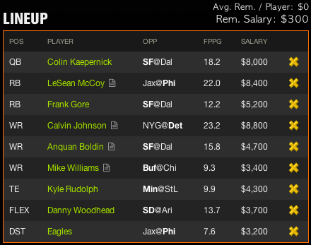 We've picked up Kyle Rudolph as a tight end for two reasons - one, you have save some money somewhere, and two, theScore has highlighted him as a quality sleeper pick. That's allowed us to pick up studs like Calvin Johnson and LeSean McCoy. When picking your team, finding "cheaper" players with value is a key to climbing the overall leaderboard.