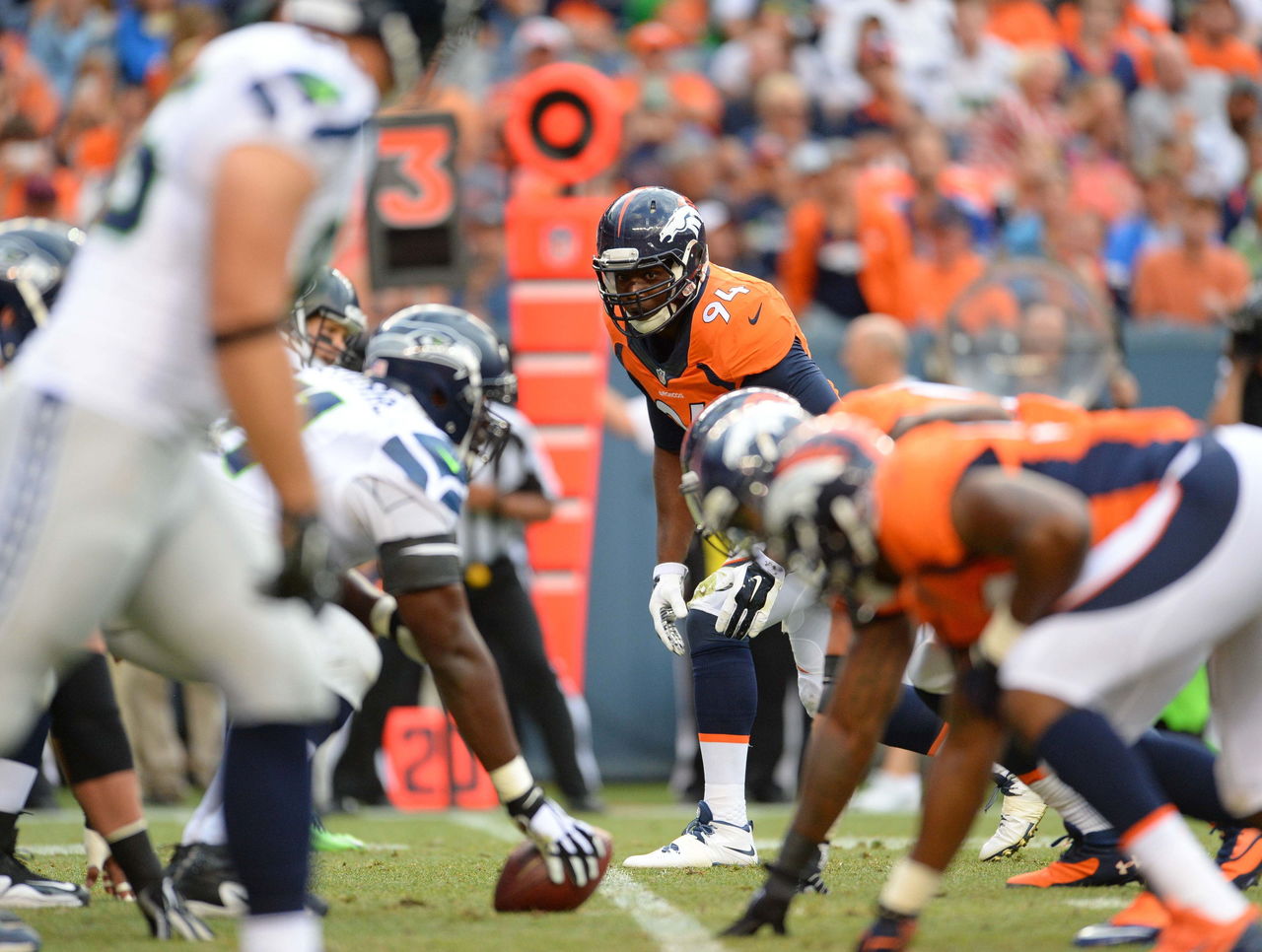 Ware fires off with a natural forward lean and extends his arms, locking up the tight end and knocking him back. The tight end’s shoulders rock. The tight end has enough of it and escapes into the flat for a quick route. Ware plants off his left foot and cuts outside, sinking his hips and turning them as he stalks Super Bowl-winning quarterback Russell Wilson. He closes fast and forces a hurried throw outside the left hash that sails high and crashes.