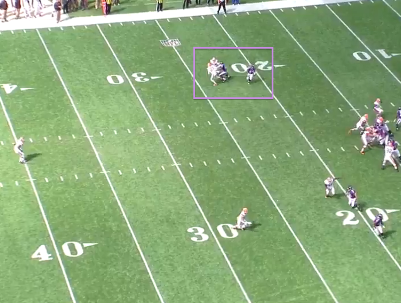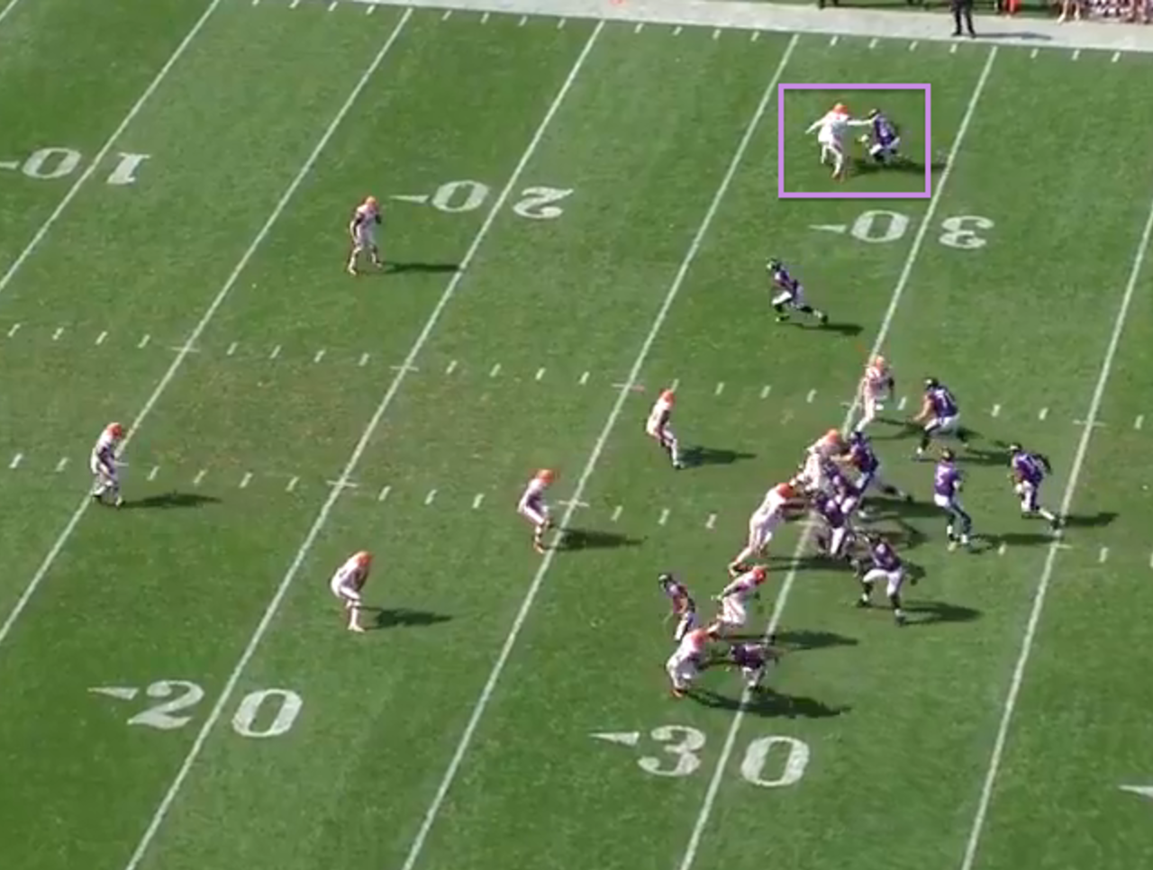 When Smith caught the pass, there wasn’t anyone close to him because the free safety was in the deep middle and the other cornerbacks had their backs turned in man coverage. Smith scampered across the middle of the field, crossing the near hash, far hash and farther numbers before Haden finally got to him after 26 yards.