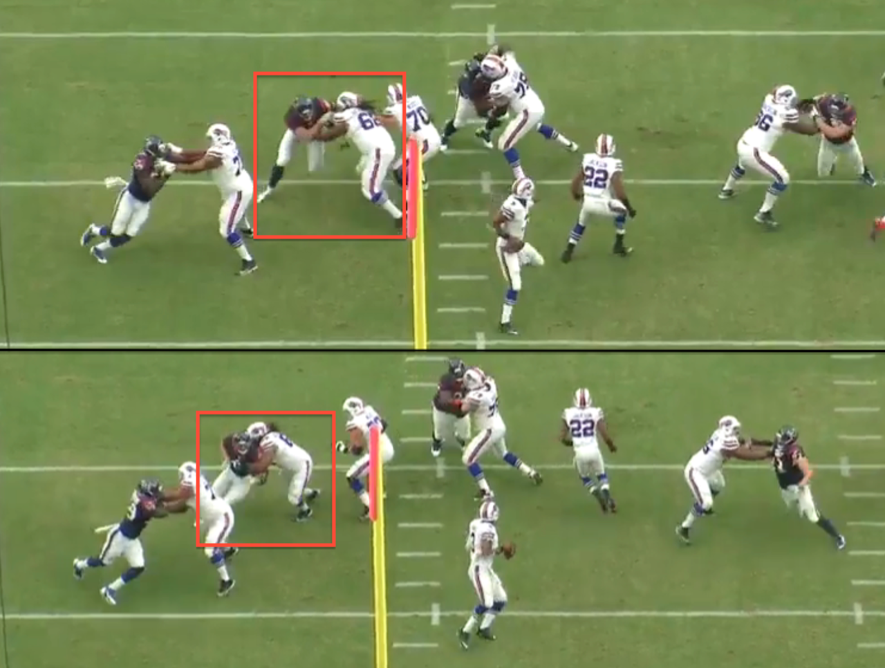 Watt leaned across the line of scrimmage and grabbed Richardson’s jersey, pulled him down and burst past him as he let go. Richardson wasn’t able to generate any power or proper hand placement because of this, leaving him to try to push Watt away from the pocket. Watt powered through, though, and sunk his shoulder as he turned the corner.