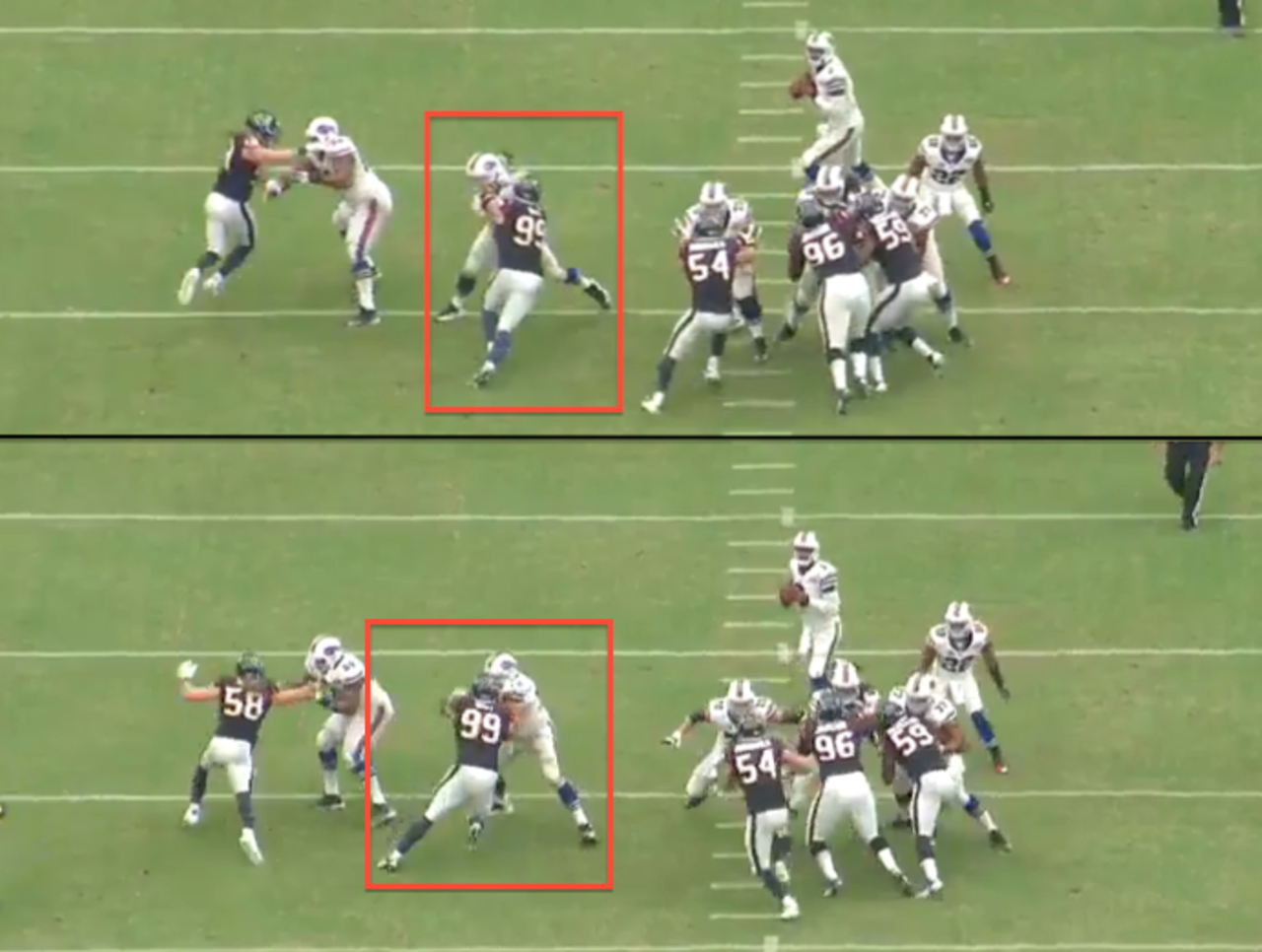 He leaned to the inside gap at the same time and burst through, pressuring the quarterback into a hurried throw.