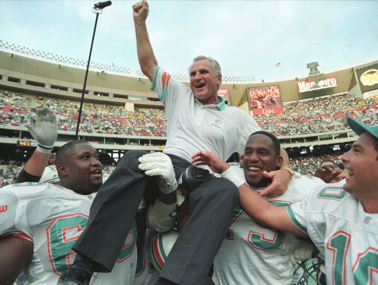 Legendary Miami Dolphins head coach Don Shula coaches against the Cincinnati Bengals, coached by his son, David. It's the first-ever meeting between father and son head coaches in NFL history.