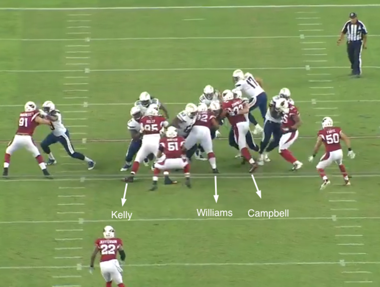 Left to right, Tommy Kelly and Campbell (before he was injured) were the ends. They are both versatile, particularly excelling at the three-technique. Kelly had a brief history of dominance at the position with the Oakland Raiders, racking up 14.5 sacks from 2010 through 2011. Campbell, a seven-year veteran, has been dominating ever since his second season with the Cardinals.