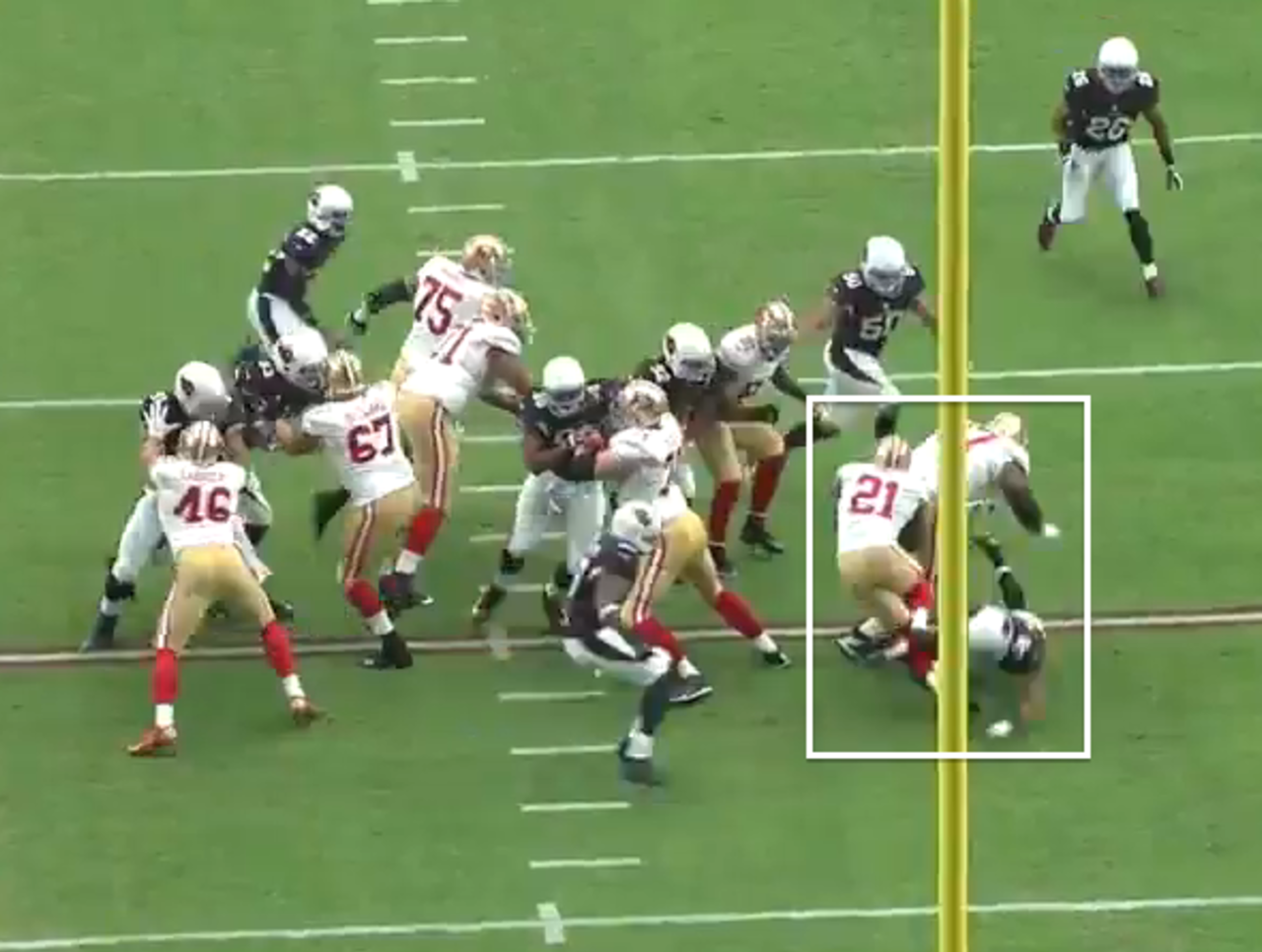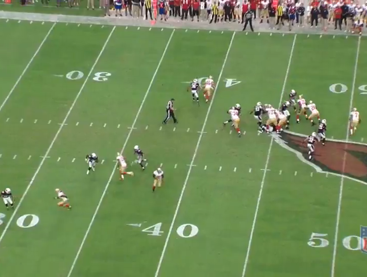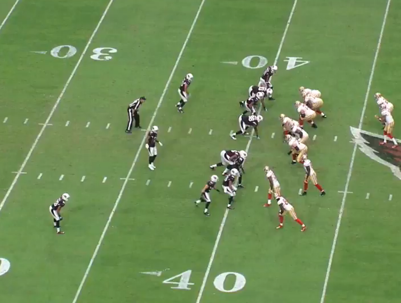 The 49ers had one back in the backfield and an unbalanced offensive line. Defensively, the Cardinals had a 4-3 Over front. That meant the three-technique defensive tackle was to the strong-side, where Bucannon was, too. Bucannon was five yards across the left tackle that was posing as a tight end.