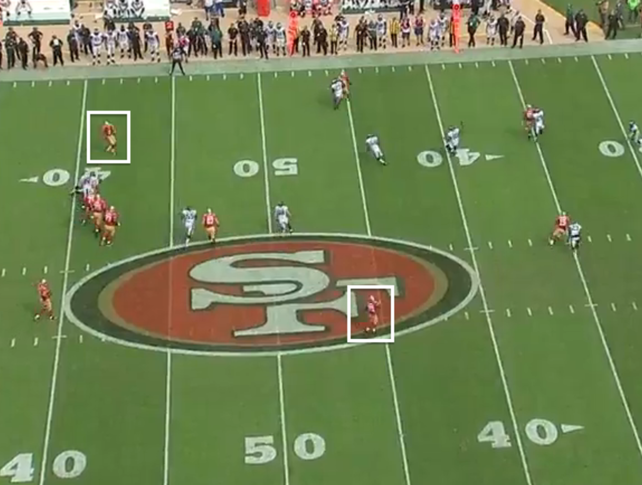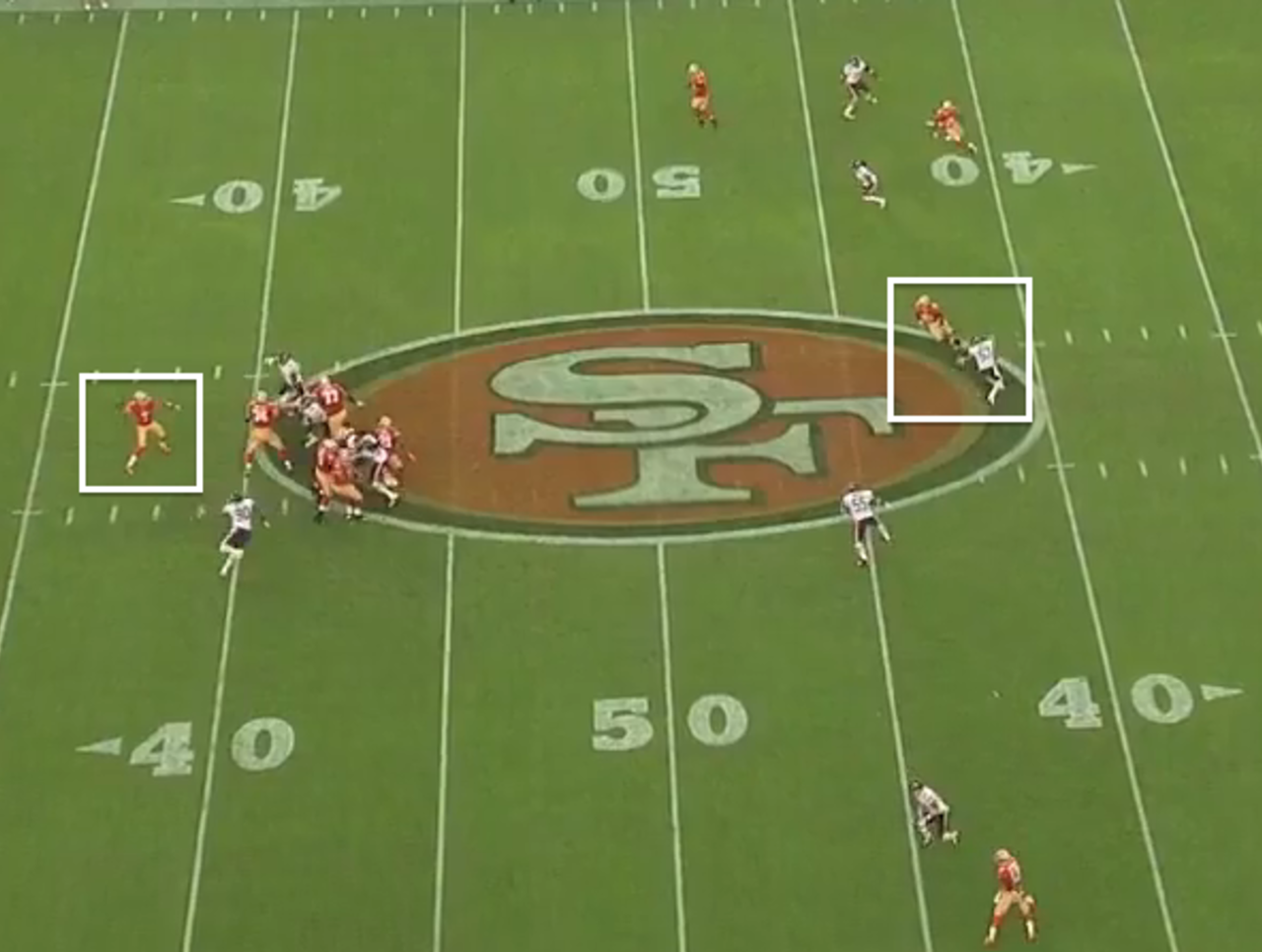 The outside receiver released outside and ran a vertical route near the numbers. To his left, a tight end detached three yards from the formation, and also released outside, running a flat route. He was open, but Kaepernick was under duress again.