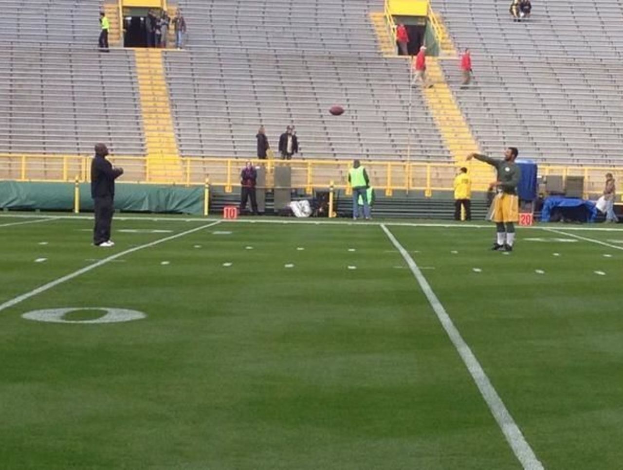 With the two teams set to face off on Sunday, father and son played catch on the field at Lambeau prior to Sunday's game.
