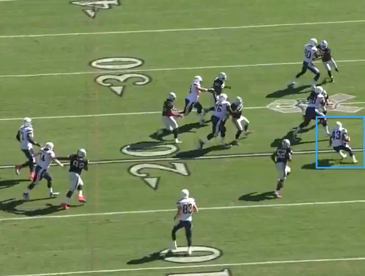 In the second quarter, the Chargers called a toss play on second-and-10. Oliver ran right and followed two tight ends who blocked in space. A third blocker, a wide receiver, was blocking ahead. He ran outside and watched the Raiders’ edge defenders run head-first toward the sideline.