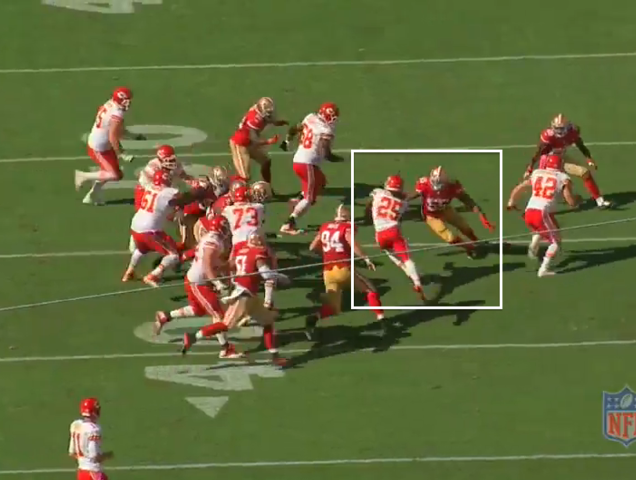 The Chiefs had the ball on their own 42 with first-and-10. Charles was eight yards in the backfield, behind a fullback. The 49ers had an eight-man box, expecting run. Neither team hid their intentions.