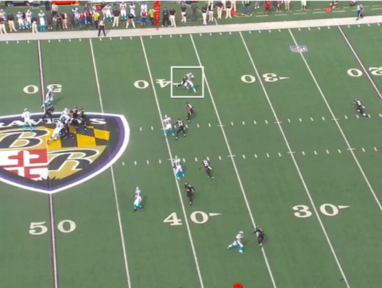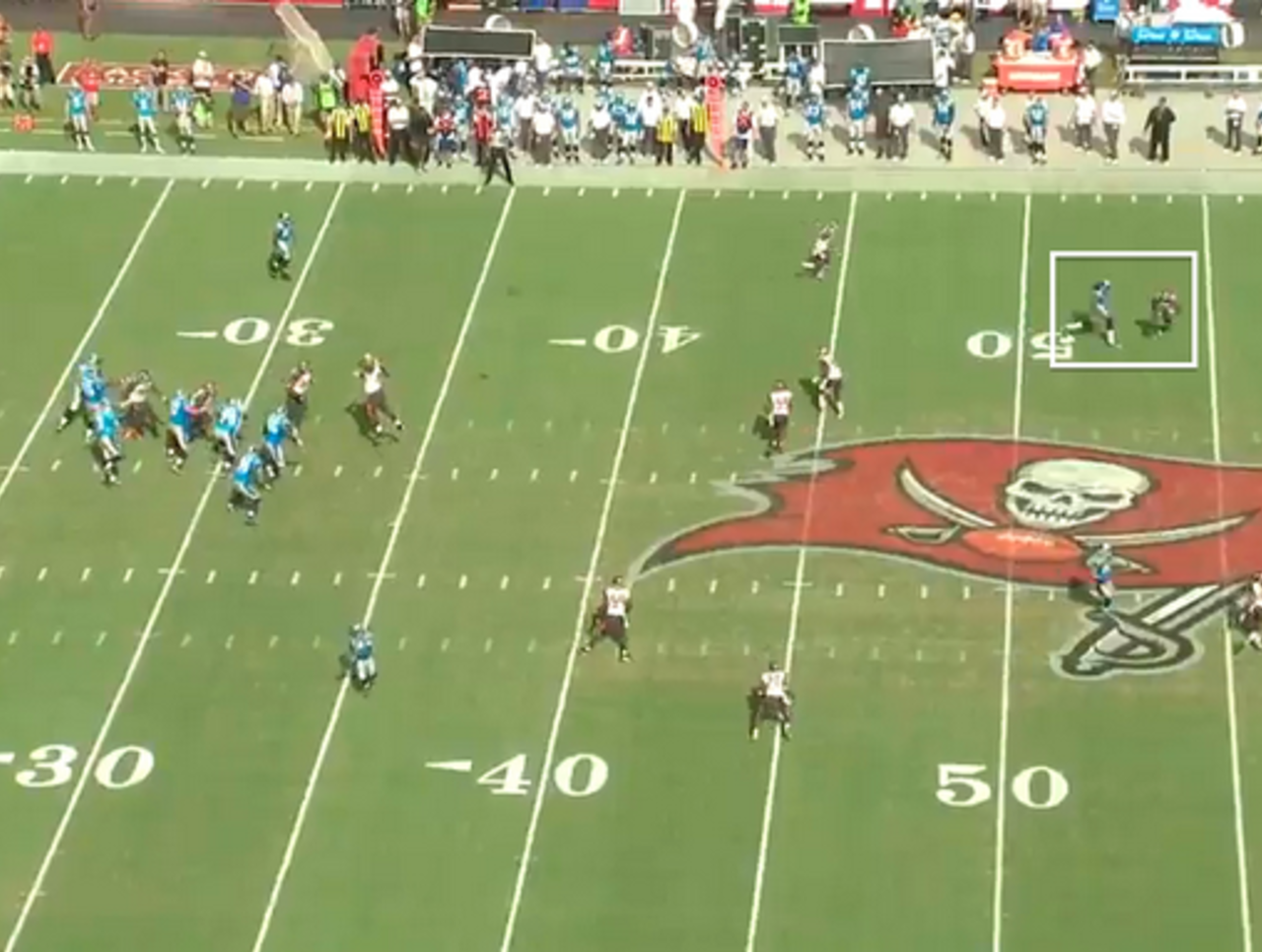 In Week 6, the game was tied in the fourth quarter. The Panthers faced third-and-long. Benjamin was lined up outside. A cornerback was in zone coverage with a 10-yard buffer.