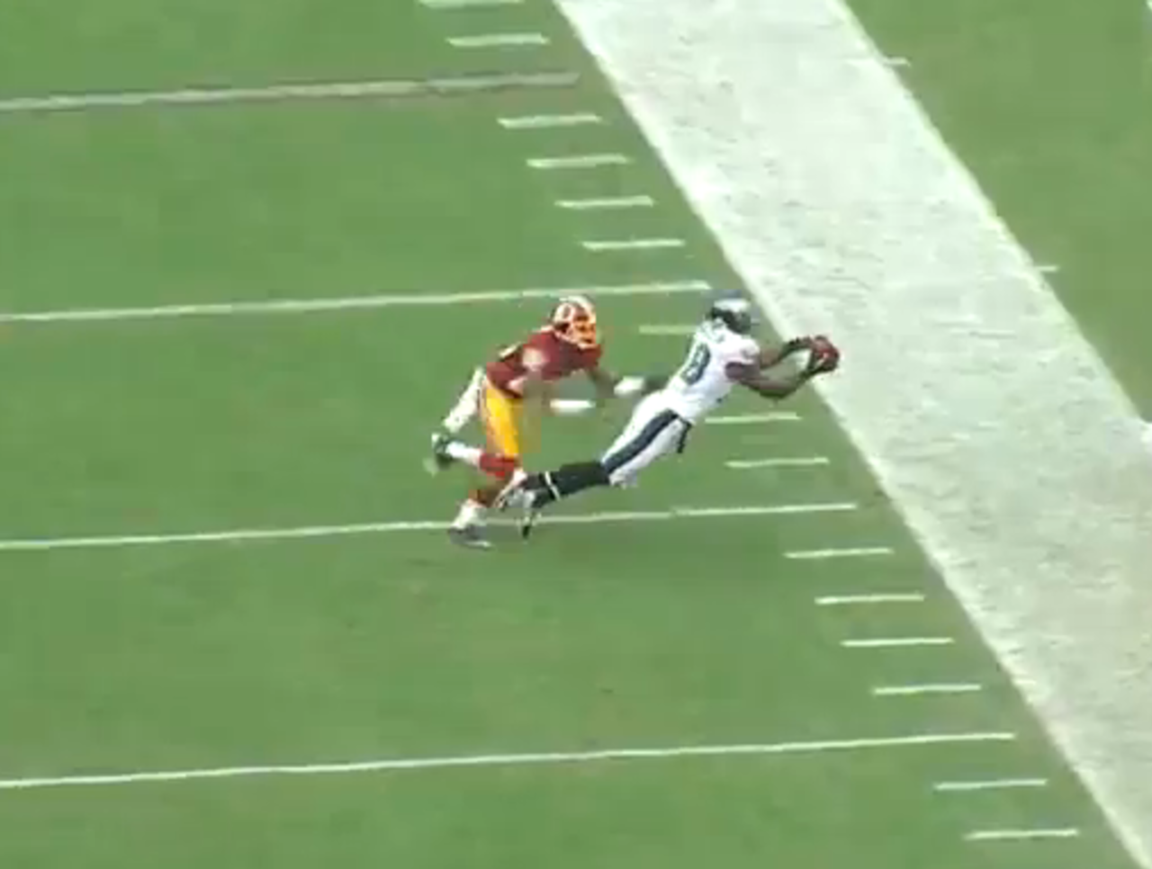 Three weeks into the season the Eagles played at home against the Washington Redskins. Maclin stood in between the numbers and the sideline. He was the No. 1 receiver from the sideline-in on the Trips Right set. A cornerback stood in off-coverage, 10 yards downfield in Cover-3. He had deep third responsibilities with instructions to not be beaten vertically.