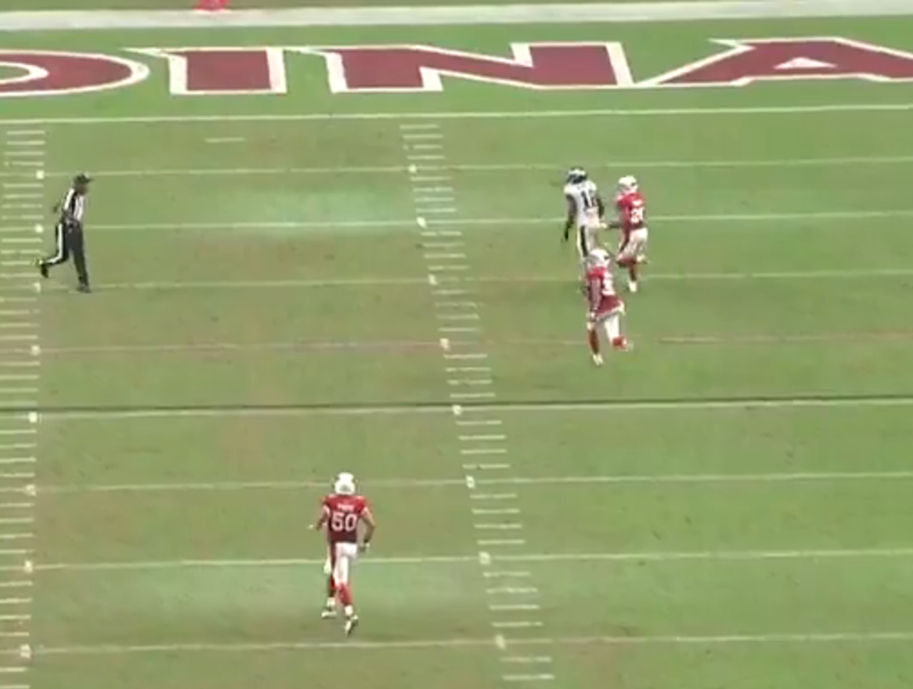 The ball parachuted down past the cornerback’s outstretched right arm. It fell over Maclin’s inside shoulder, in front of his chest and into his open palms. Maclin fell over when he caught it, crushed his leg in half and landed on his side. He then rolled over onto his back, before standing up and walking over to stare down the Cardinals fans.