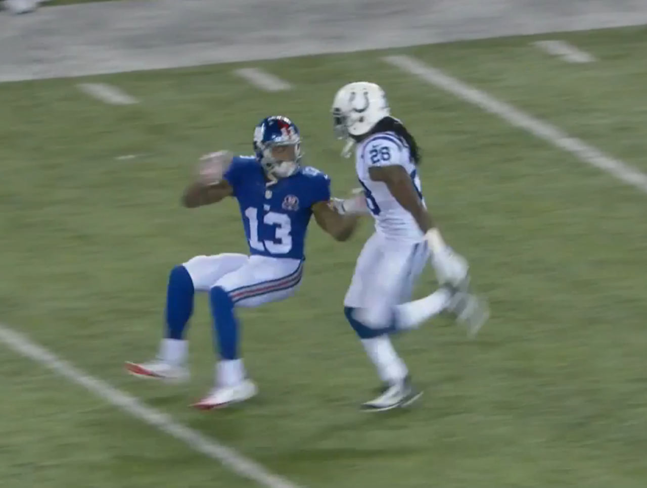 The cornerback continued to run downfield and eventually circled to slow down. He was a couple yards behind when Beckham Jr. came back for the ball. After catching it, he zoomed past the cornerback again downfield, down the sideline before he cut back past the safety and across the field for a 59-yard gain.