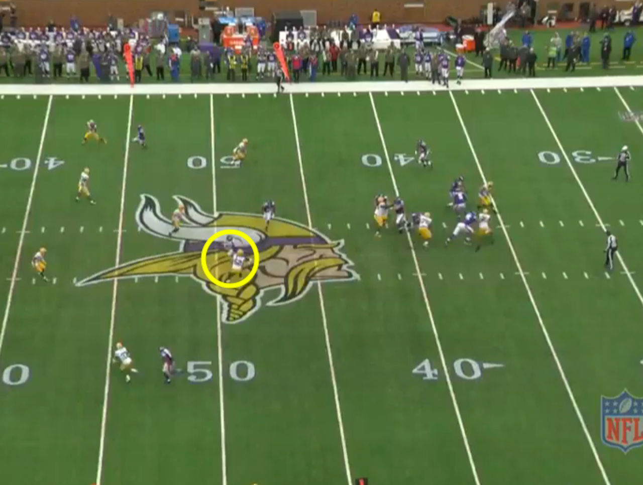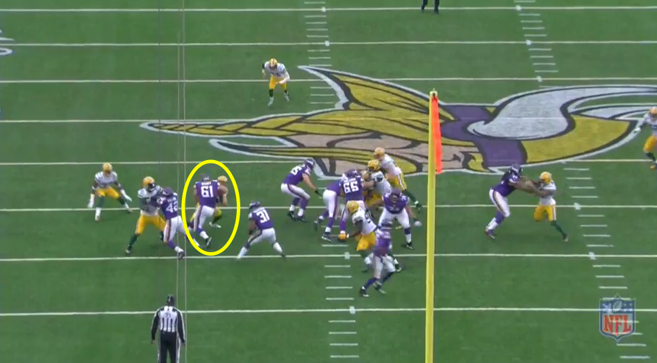 It was first-and-10 when Matthews read run and attacked downhill. He saw the VIkings run a power play with the right guard pulling from the back side, directly at him. The running back followed the right guard.