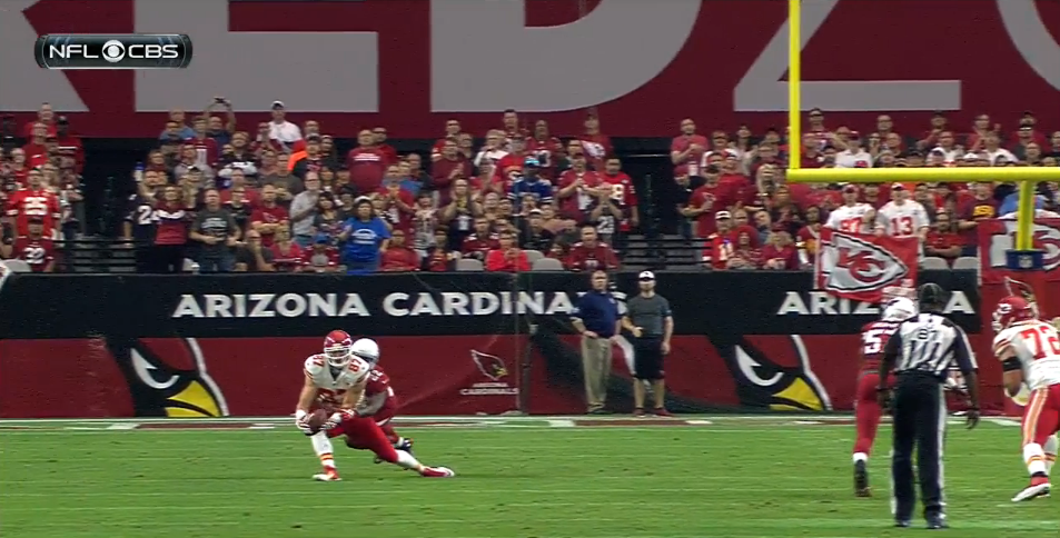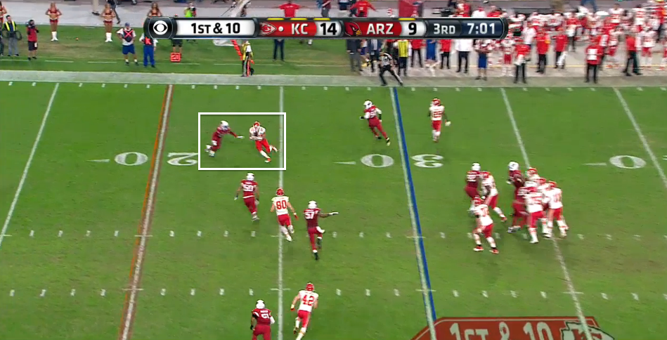 With seven minutes to go in the third quarter, Kelce was at the far right of the field, in between the 30 and the sideline, one-on-one against a Cardinals cornerback.
