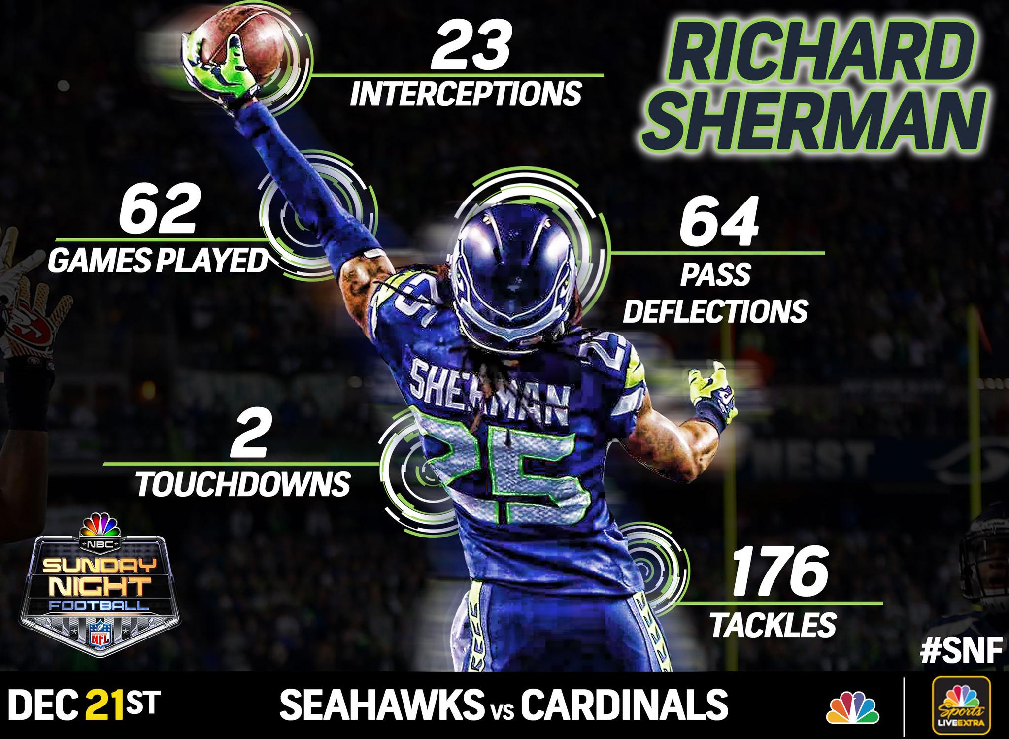 Sherman's ridiculous stats. This handy little infographic shows how incredible Richard Sherman's career has been thus far.