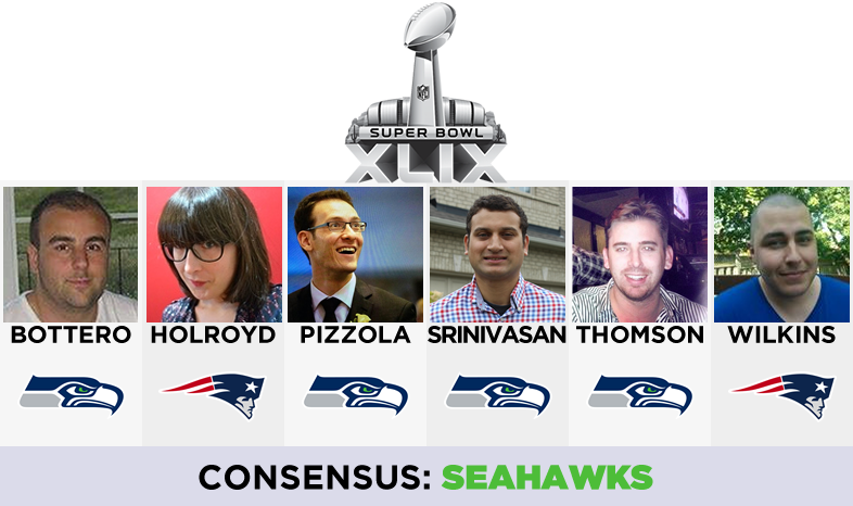The staff at theScore put on their prognosticator hats and made predictions for Super Bowl XLIX, highlighting reasons for their choices. The pickers are Gino Bottero, Caitlyn Holroyd, Rob Pizzola, Arun Srinivasan, Joe Thomson and Dan Wilkins.
