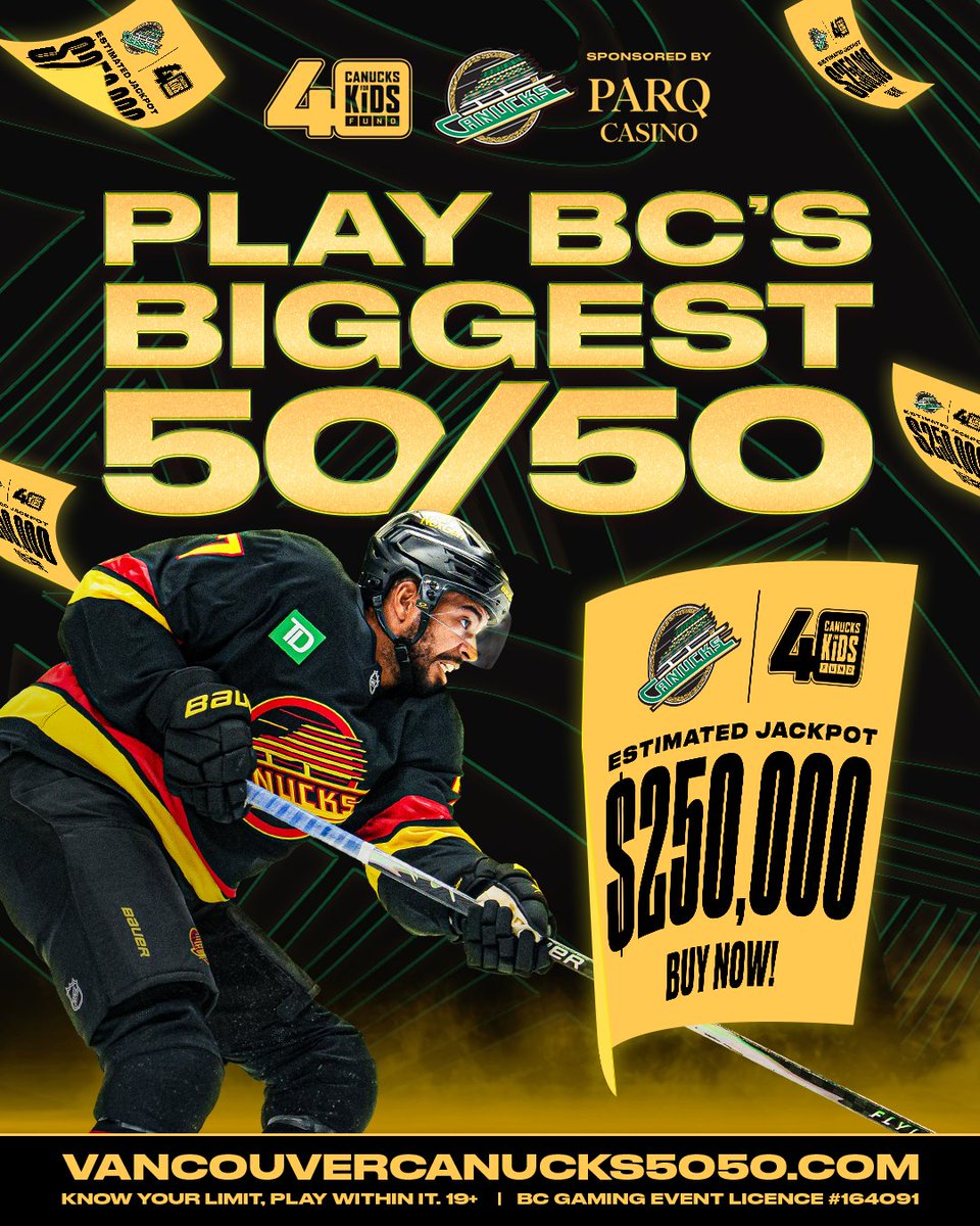Vancouver Canucks@CanucksThe @Canucksforkids 50/50 raffle sponsored by @parqvancouver...2 months ago•