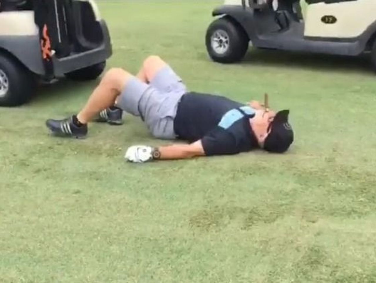 The friend was attempting to hit a shot while balancing on the edge of the water when he fell backward, completely submerging himself. Everyone had a good laugh about the mishap, especially this cigar-smoking fellow: