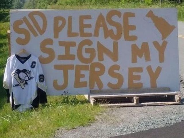 Patricia Lingley-Pottie's husband Darryl placed a plywood sign - complete with a hanging Crosby jersey - outside their home in Enfield, Nova Scotia, with a simple message: "SID PLEASE SIGN MY JERSEY."