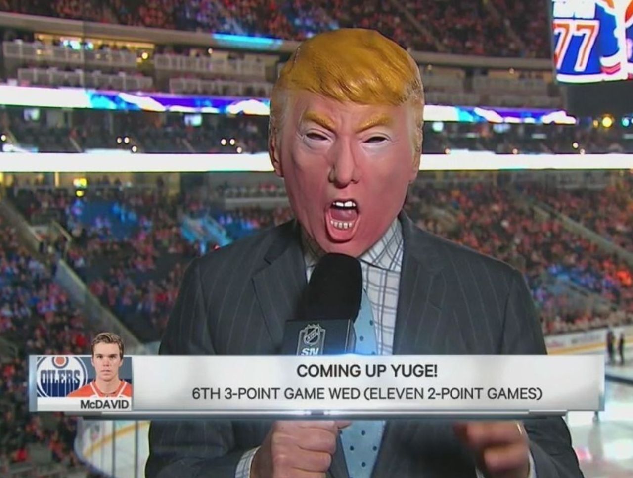 Oilers broadcaster dons Trump mask, makes presidential puns in pregame hit