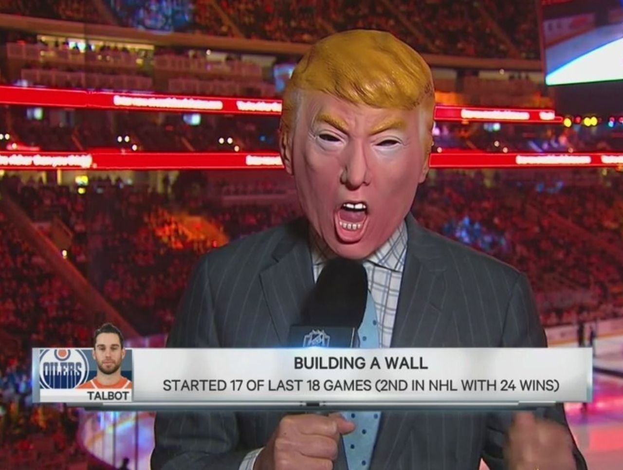 Then came mention of Oilers goaltender Cam Talbot as a tie-in with Trump's proposed construction project along the U.S.-Mexico border.