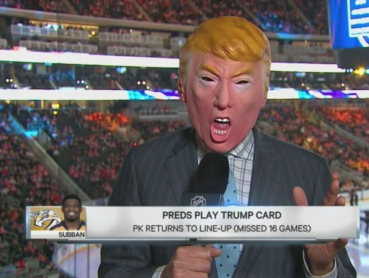 Wearing a truly frightening Trump mask, Principe opened his scene-setter by highlighting Connor McDavid's production with a reference to the president's pronunciation.