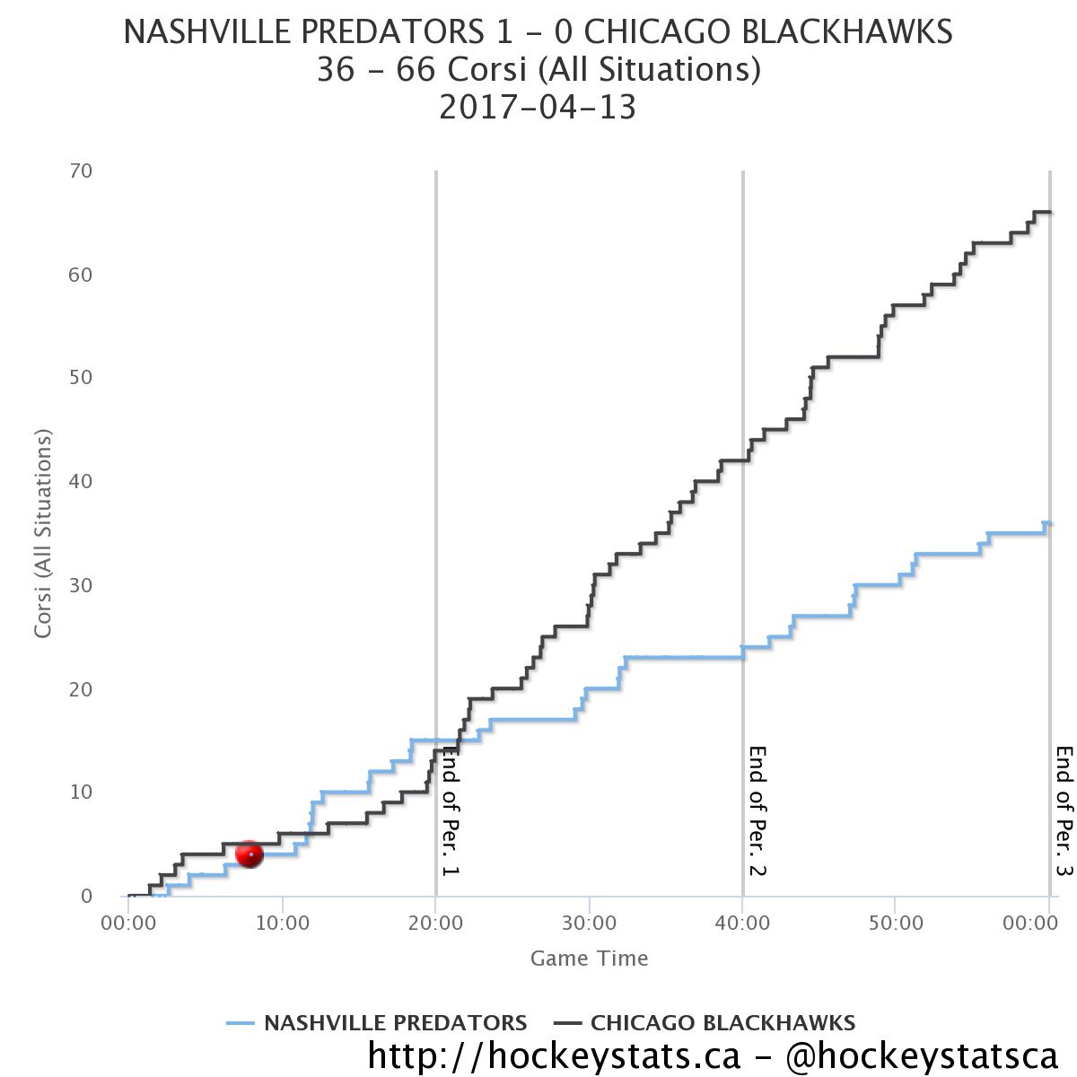 As the following shot attempt table shows, the Blackhawks dominated the contest from the beginning of the second period on, with Rinne making a huge difference in the outcome.