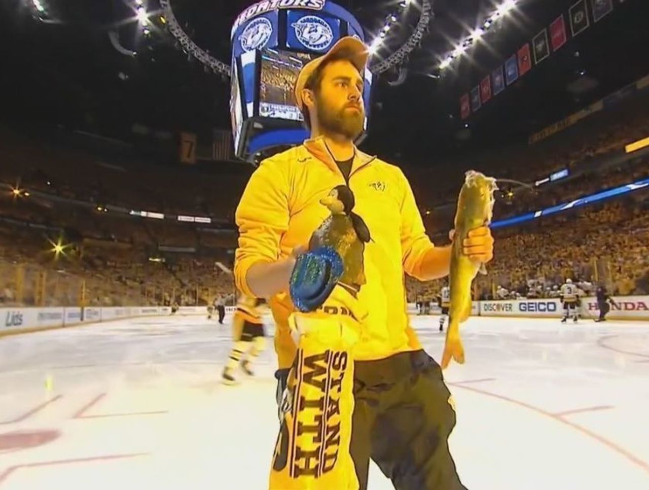 Prior to the start of Game 4 of the Stanley Cup Final, several catfish were tossed onto the ice. One in particular was quite unique, in that it was decked out in a rally towel and a sparkly blue cowboy hat, and also had a stuffed penguin in its mouth.