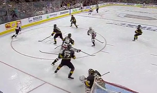 Oshie one-timed the pass, forcing a quality save from Marc-Andre Fleury that led to a scrum outside the blue paint, where the Caps were outnumbered three to two. But, with Oshie tying up his man, Nicklas Backstrom swooped in to aid his winger and regained possession.