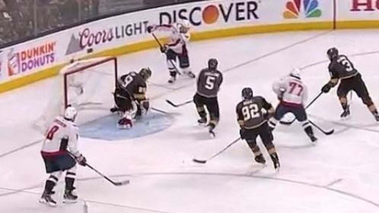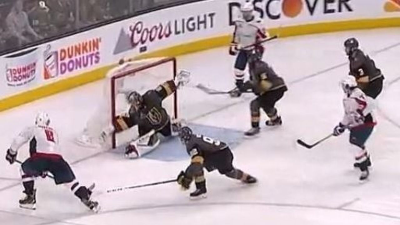 The Golden Knights initially appeared to be in decent shape. As Nicklas Backstrom moved the puck to John Carlson at the point, Deryk Engelland (positioned in front of the net) made sure to get his stick in Ovechkin's shooting lane, anticipating a potential pass from Carlson.