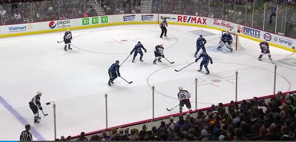 We pick things up with Rantanen (No. 96) controlling the puck as Colorado sets up with about 20 seconds left in the penalty to Canucks center Bo Horvat.