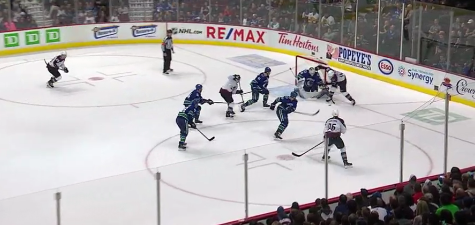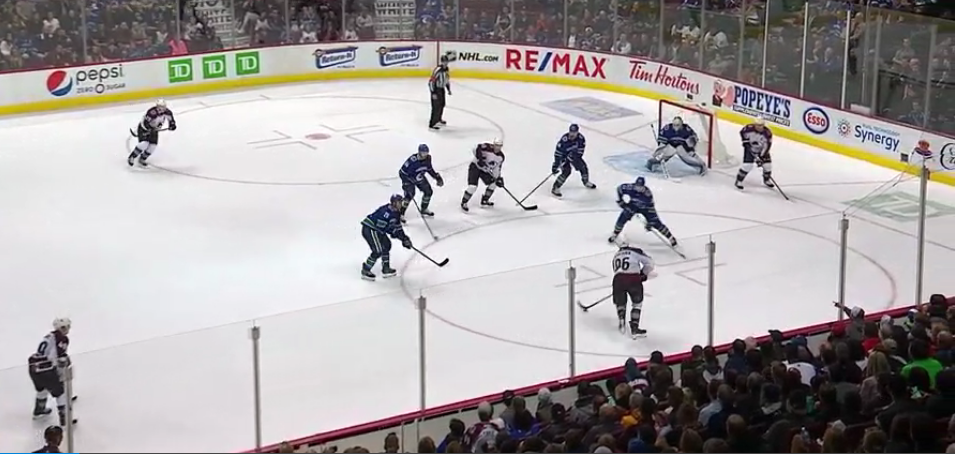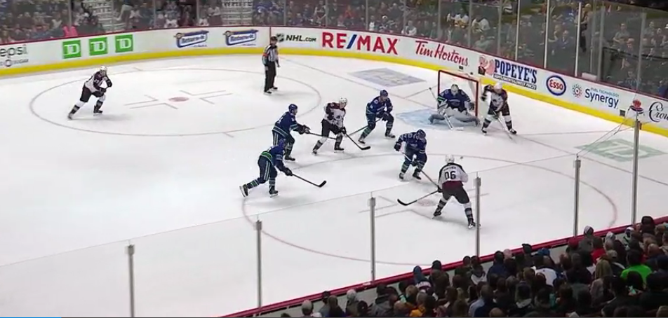 Rantanen evaluates his options with Landeskog planted down low, Matt Calvert in the slot, Tyson Barrie at the blue line, and with the path to MacKinnon obstructed by two Canucks penalty killers.