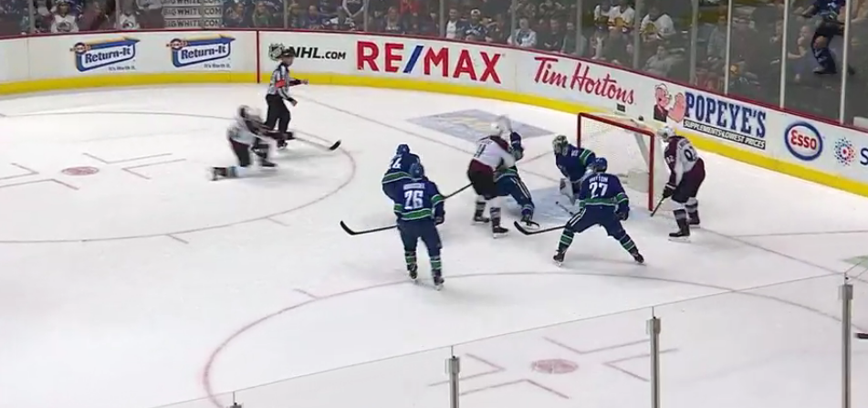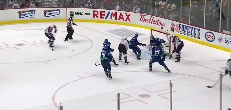 Hutton appears to be playing Rantanen well, but the Avalanche winger feathers a beautiful pass between the blade of Hutton's stick and the Canucks rearguard's skates, and the puck goes by him on the way to Landeskog.