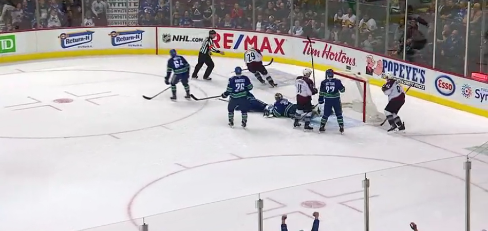MacKinnon goes down on one knee and rips a one-timer, to which Canucks goaltender Jacob Markstrom barely has time to react.