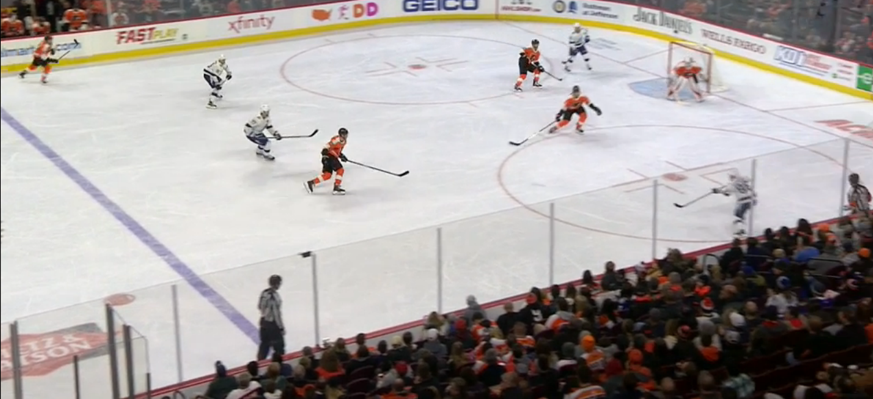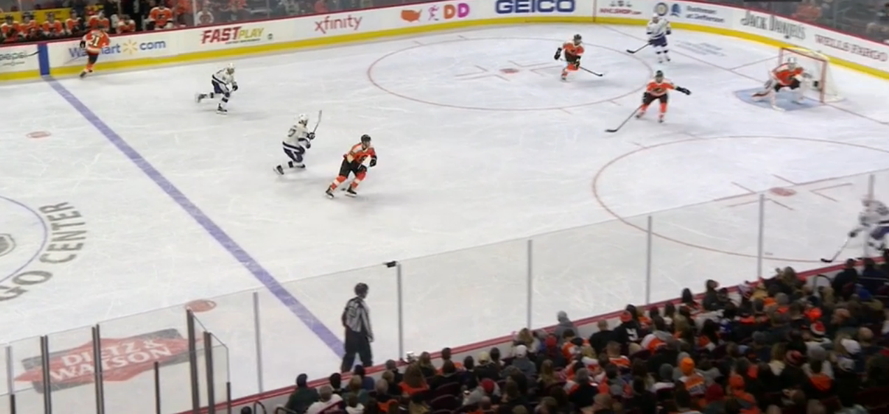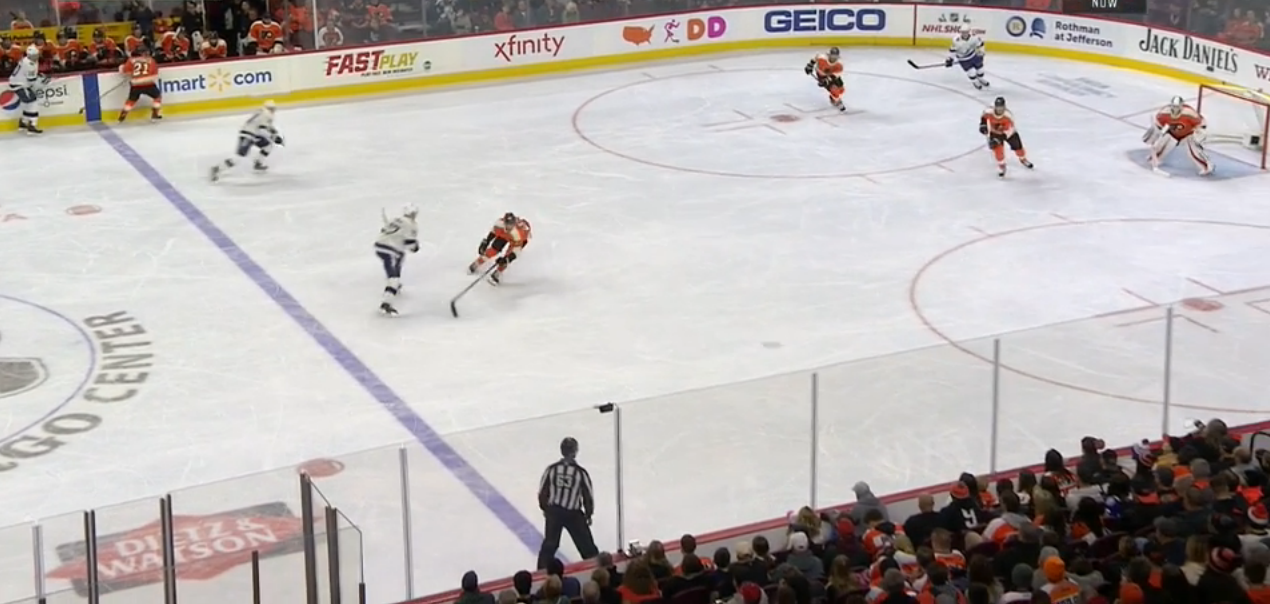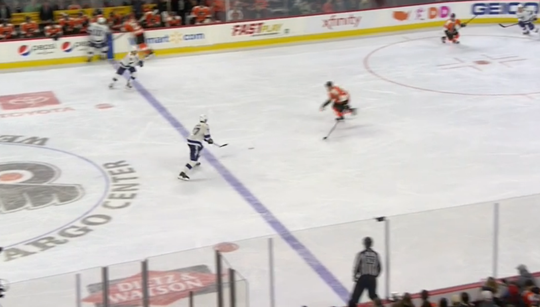 J.T. Miller fires the puck into the Flyers' zone, and it heads to Hedman at the blue line after bouncing off Dale Weise's left skate.