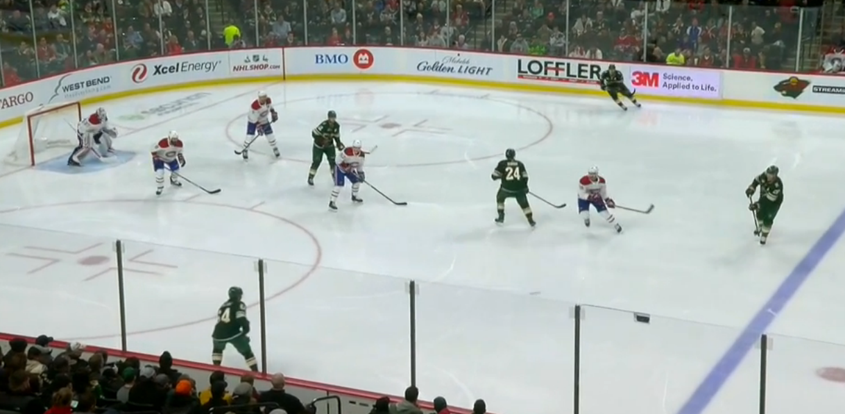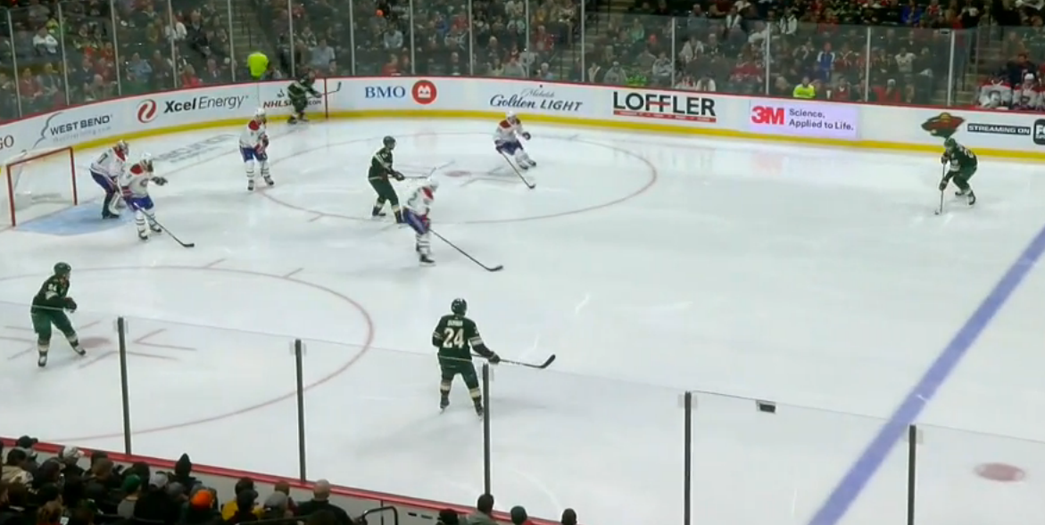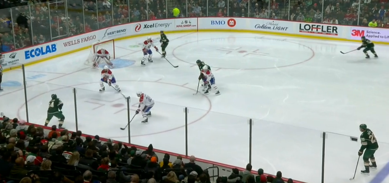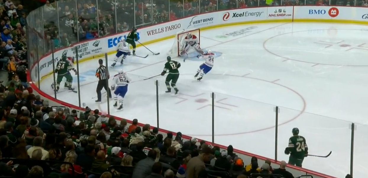 As we begin, Zach Parise has the puck behind the Canadiens' net, but the Wild aren't fully set up yet.