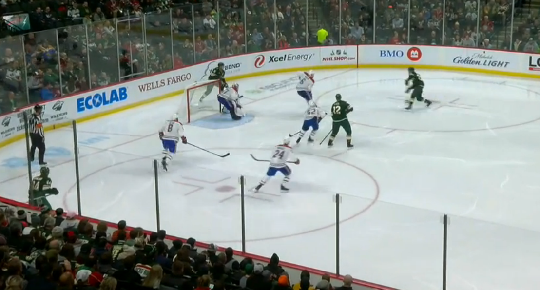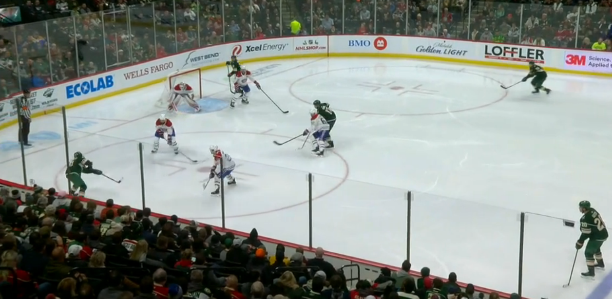 Granlund moves in down low and draws a pair of Canadiens defenders, with two more nearby. His passing options appear limited, but a certain Wild blue-liner is lurking unmarked on the far side.