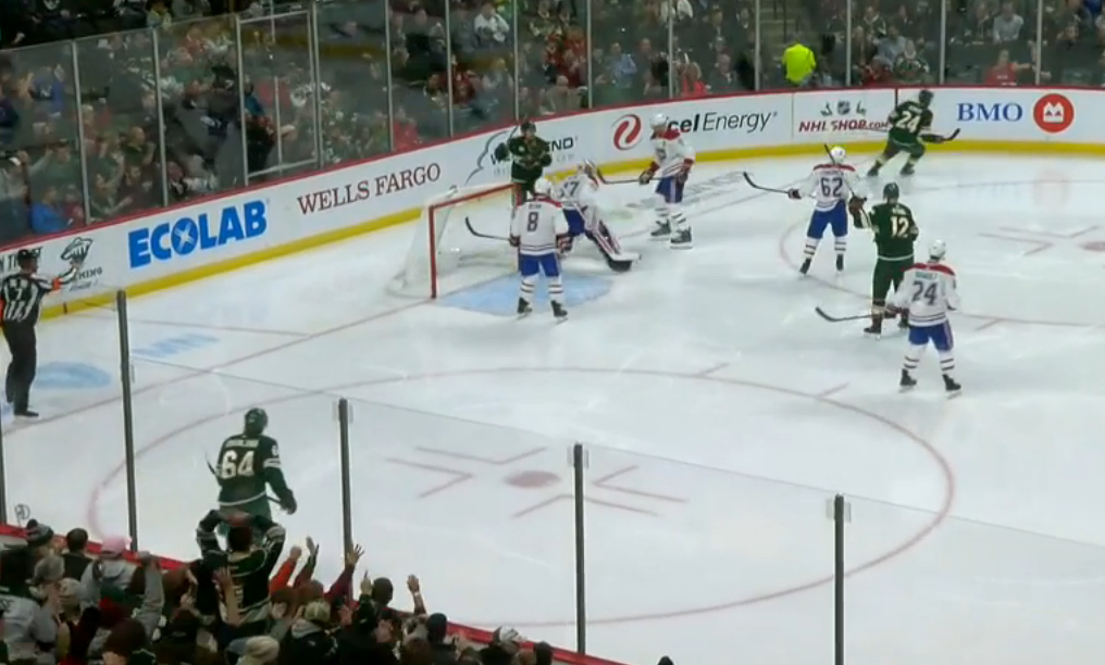 The wrister ricochets off both posts and past Canadiens goaltender Antti Niemi to give the Wild a six-goal lead.