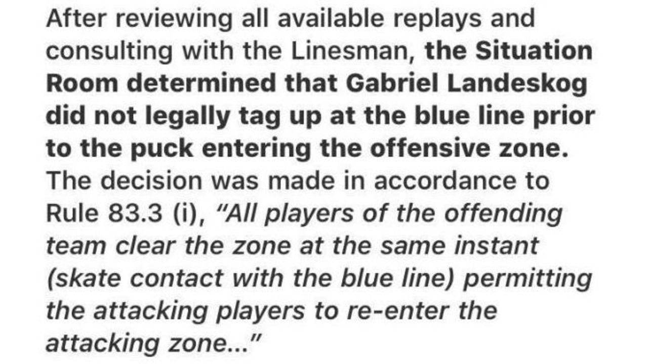 The tape revealed Gabriel Landeskog, who had been trying to make a line change, was on the wrong side of San Jose's blue line prior to Colorado's zone entry. Here's part of the explanation released by the league: