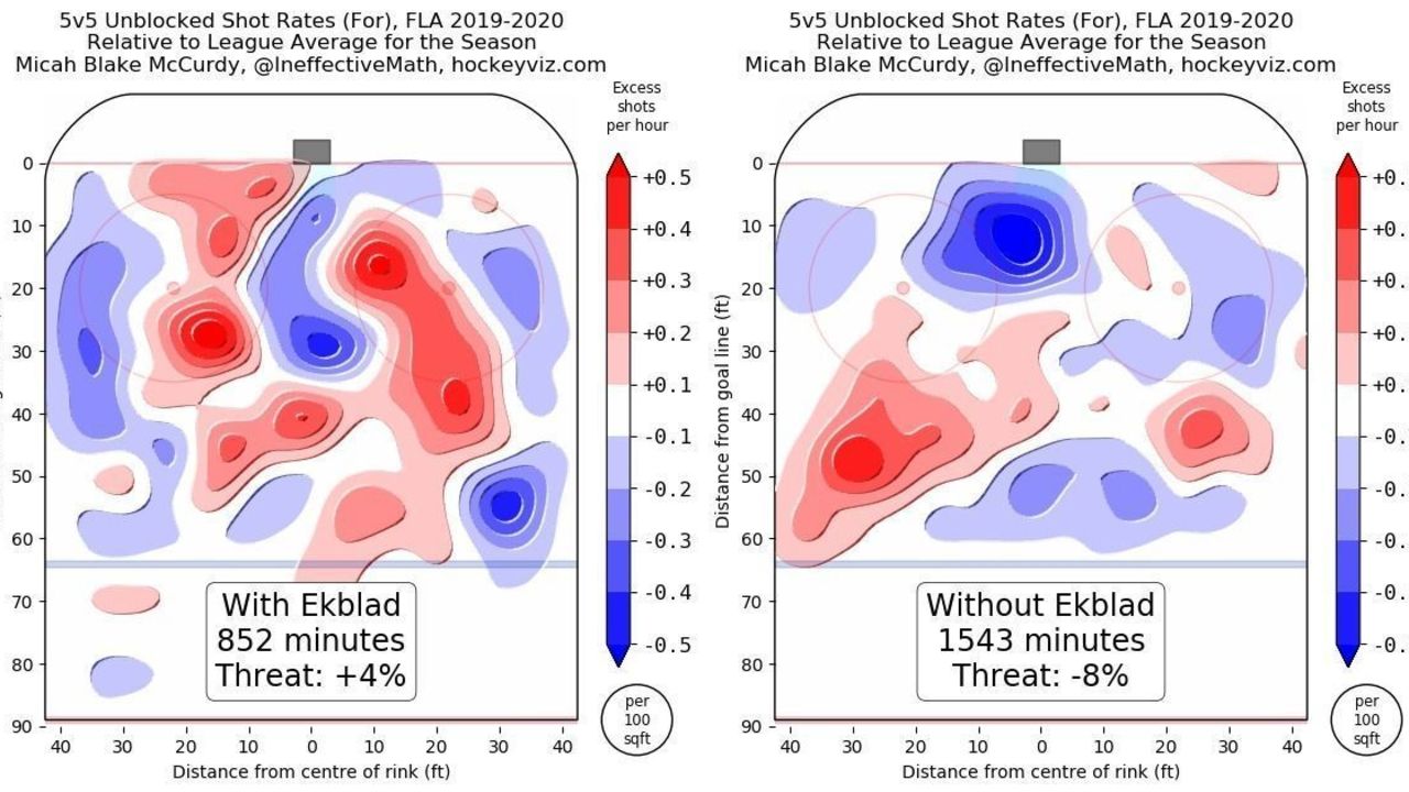 It's fair to suggest Panthers coach Joel Quenneville is pleased with the early returns. Powered by the NHL's most potent offense, Florida has a 28-16-5 record, which at the All-Star break places the team third in the Atlantic Division and eighth overall in points percentage. With Ekblad, the Panthers have been an objectively better squad at five-on-five. Based on the heat maps below, the club takes higher-percentage shots in the offensive zone when he's on the ice versus when he's not. Key in on the red blobs: