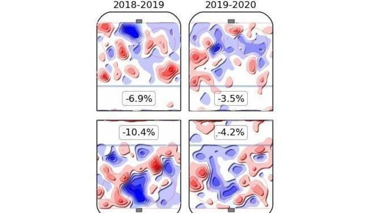 The 26-year-old has excelled defensively over the past two seasons, according to HockeyViz's isolated five-on-five impact (blue zones, negatives are good in the defensive end):