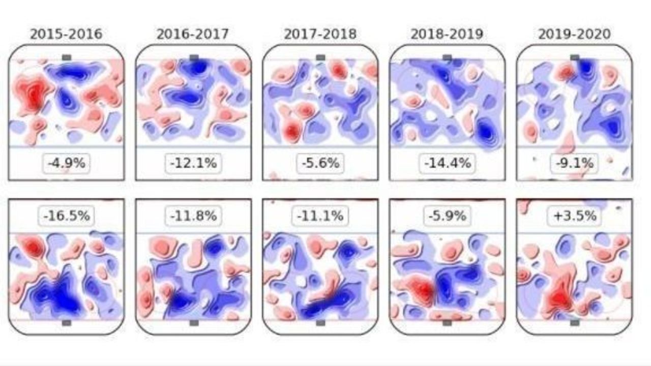 Red is good in the offensive zone (top row), blue is good in the defensive zone (bottom).