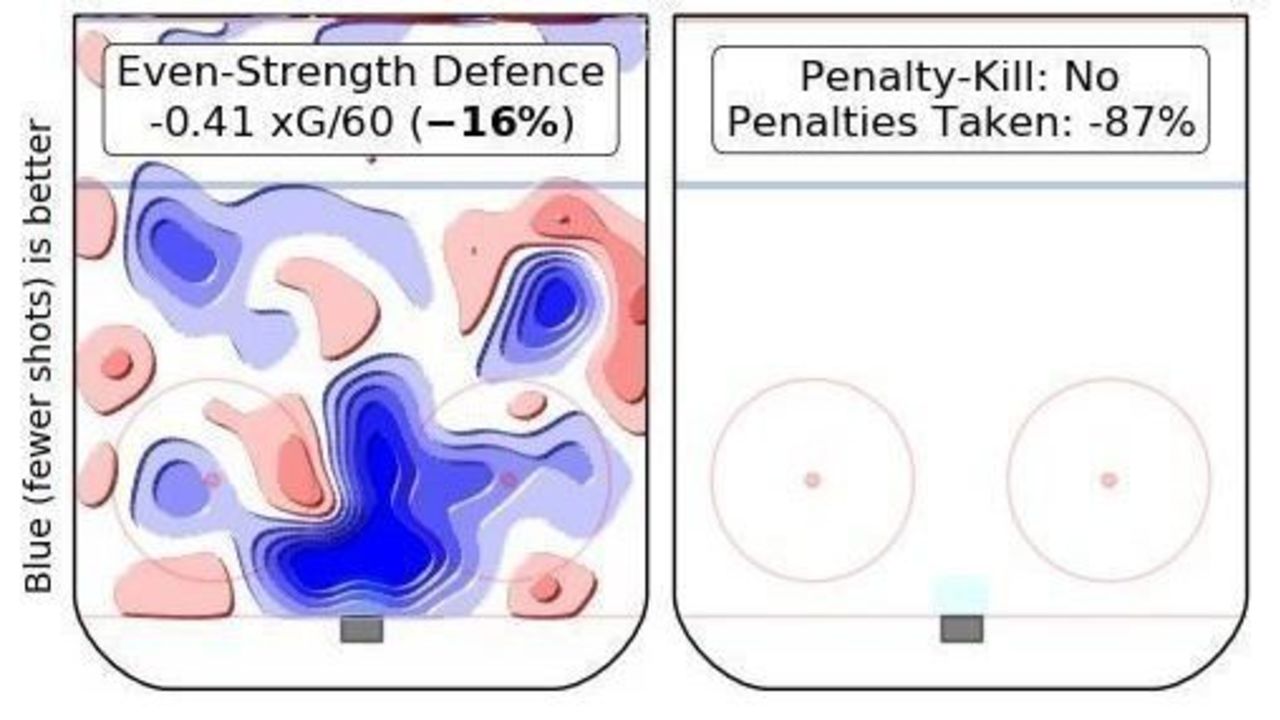 Nichushkin registered only 13 goals and 14 helpers in 65 games with the Avs last season. But he posted some elite defensive metrics, according to HockeyViz (zero is league average, anything under that is considered good):