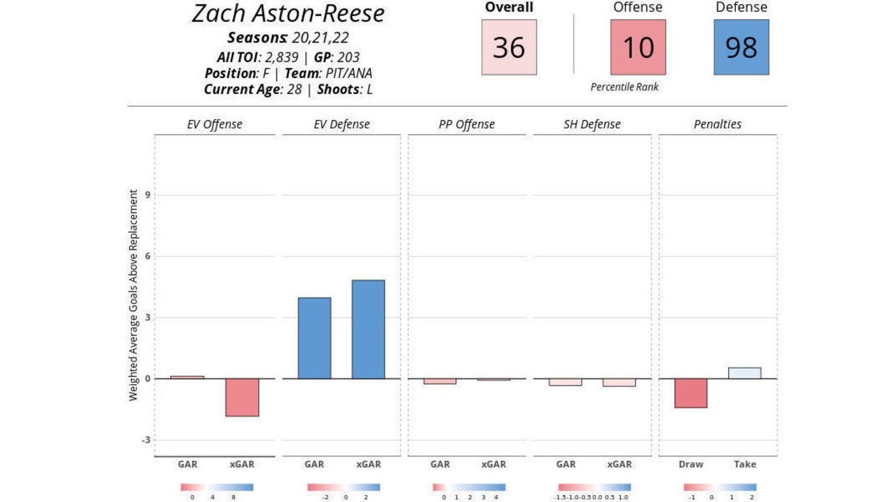 Aston-Reese recorded five goals and 10 assists in 69 games last season split between the Pittsburgh Penguins and Anaheim Ducks. The 28-year-old is not known for his offense, but he's perennially posted elite defensive metrics.